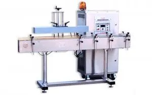 Машина индукционной запайки пластиковых и стеклянных бутылок HL-2000A, уплотняет бутылку фольгой и подает транспортёром через индуктор, затем создается высокая температура и расплавленная фольга прилипает к горлышку бутылки.